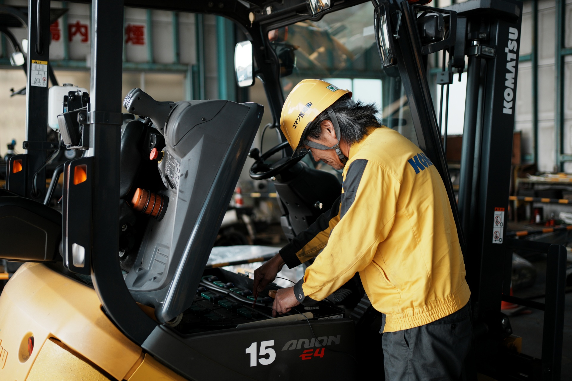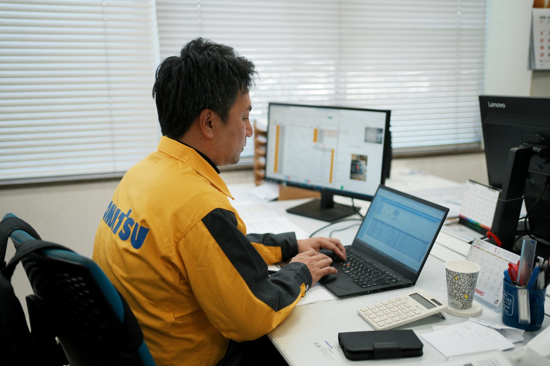 整備スタッフの仕事内容は、建設機械のアフターメンテナンス、修理対応、機械のアタッチメントなどの販売対応です。販売された油圧ショベルやホイールローダーなどの建設機械(重機)のメンテナンス・修理を行います。基本的にはお客様先や機械を使用する現場で対応します。