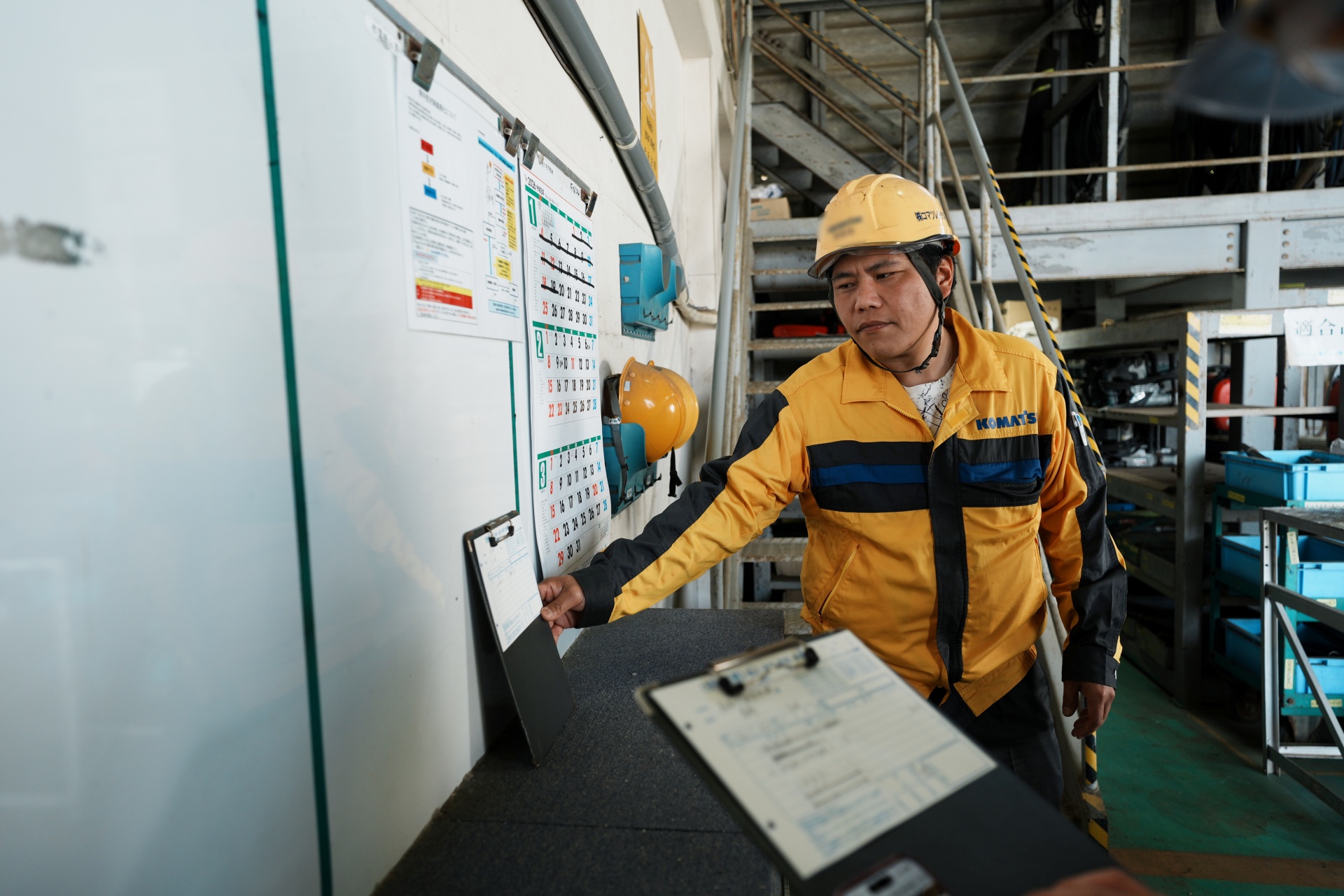 レンタル品の点検はアプリの項目に沿って行います。業務は基本的にヤード内(作業場内)で行っており、全員が一連の業務をできるようにしています。レンタル品を貸し出す際にはクレーンなどを使って積み込み作業を行います。難易度の高い修理はグループ会社のコマツ宮崎へ依頼します。